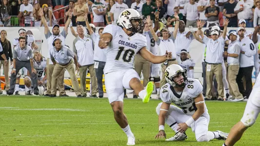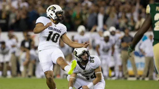 2015 (Jr.)—He emerged as CU’s regular placekicker after winning the job early in fall camp. He connected on all 35 of his extra point attempts—helping to extend Colorado’s streak to 138 made in a row—and made good on 18-of-29 field goal attempts. He made the first five of his career before the next was blocked by Colorado State, and despite missing a 48-yard kick that would have won the game in regulation, he came back and made a 32-yard boot in overtime to give CU a 27-24 win (those were his first two attempts at a game winning kick on any level of football in his life). He had two long kicks of 52 yards (made against CSU and Oregon), and the 18 field goals were the most in a first season as CU’s regular kicker, topping the old mark of 15 set by Fred Lima in 1972. He made three field goals against UCLA (25, 23 and 45 yards) and connected on two in five other games. His 89 points scored were the fifth-most point scored by kicking in a single-season at CU (record in 98). In the spring, the coaches selected him as one of two recipients of the Bill McCartney Award, presented to the players who were the most improved on special teams. He also won the Iron Buffalo Award for the specialists during spring practice, which recognizes hard work, dedication, toughness and total lifting performance.
