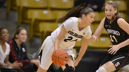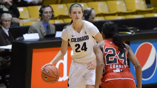 2014-15 (Sophomore): A regular in the rotation, she played in all 32 games averaging 4.5 points and 1.6 rebounds. Huggins was second on the team with 43 3-pointers and hit 38.4 percent from long range, ranking 11th in the Pac-12. Her percentage tied Annan Wilson (1989-90) for the 19th best single-season performance in team history (based on a minimum of 50 attempts). She made 14 of her final 28 from 3-point range including 7-of-13 over her final four contests. All but two of her season's field goals came from beyond the 3-point arc. Huggins scored a season-high 12 points, hitting 4-of-7 from 3-point range, in the double overtime win over Colorado State (11/29). Three of her 3-pointers came during the overtime sessions; two in the final minute of the first overtime, including one with 1.7 seconds left to force double overtime. Huggins had a nearly identical outing in her next game scoring 12 points on 4-of-7 shooting against San Jose State (12/5). She totaled four games scoring in double figures, the last coming in CU's Pac-12 Tournament win over USC (3/5) where she had 11 points, hitting all three 3-point attempts. Huggins scored the final point in Colorado's upset win over No. 8/9 ranked and top seeded Oregon State in the Pac-12 quarterfinals. After the Beavers made a shot to close CU's lead to two points, Huggins controlled the inbounds pass and hit a free throw to provide the final margin.